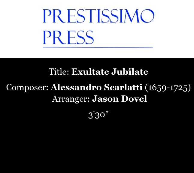 Exultate Jubilate for Brass Quintet$15$15https://schema.org/InStockusdPrestissimo Press: Jason DovelPrestissimo Press: Jason DovelI want this!Size1.39 MBLength27 pagesAdd to wishlist New wishlistShareShare on XShare on Facebook Copy linkCopy product URL